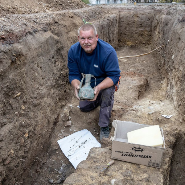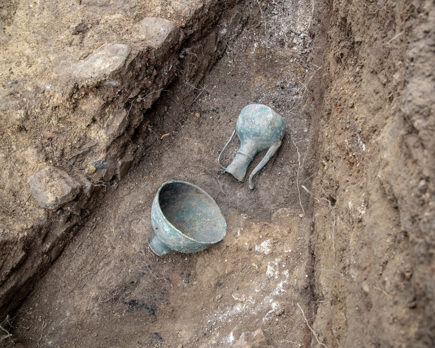 A szokásos edénytöredékek, állatcsontdarabok mellett november 6-án délután az épület kőfala mellett két darab, teljesen ép állapotú rézedény került elő. Az egyik egy kiöntőcsöves kanna, a másik egy talpas tál. Az előkerült kannatípusból mindössze két darabot őriz a Janus Pannonius Múzeum Baranya megye területéről. A tál kerámiából készült változata gyakori tárgytípus, de fémből készült darab még nem ismert a megyéből. Összességében tehát két ritka és jelentős tárggyal gyarapodott a Janus Pannonius Múzeum régészeti gyűjteménye. A két edény dokumentálás után a restaurátorműhelybe került. Csornay Boldizsár, a Janus Pannonius Múzeum igazgatója elmondta: örül az újabb eredményeknek, s a két műtárgy a jövőben létrehozandó állandó régészeti kiállítás része lesz.