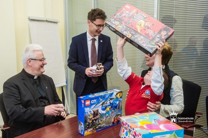 Az ajándékozásra a Fejér Megyei Hírlap székházában került sor. A kisfiú Richter Flórián cirkuszművésztől kerekesszéket, Cser-Palkovics András polgármestertől és Spányi Antal megyéspüspöktől pedig speciális futóbiciklit és játékokat kapott.