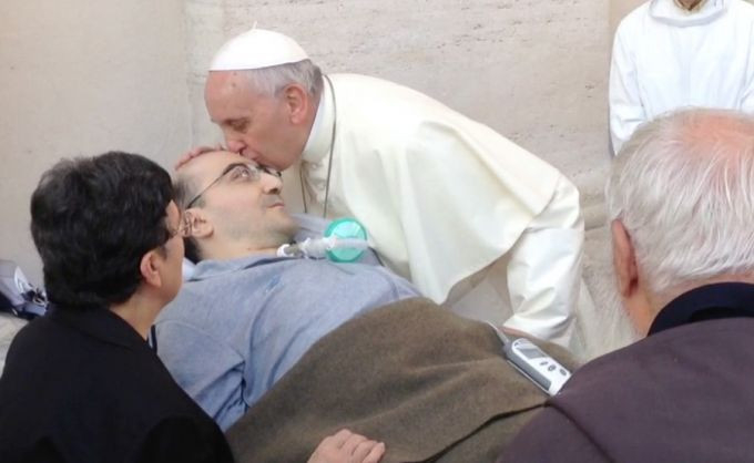 A 42 éves Salvatore D’Argento 24 éves kora óta ágyhoz kötve él egy dzsúdózás közben bekövetkezett baleset miatt az olaszországi Chietiben. 1995-ben történt balesete óta a szeptember 10-i általános kihallgatáson való részvétel volt a második alkalom, hogy elhagyta otthonát. Ferenc pápa őt üdvözölte először, miután az audiencián kilépett a zarándokok közé a Szent Péterre. A Szentatya a pápamobilról leszállva megáldotta az ágyhoz kötött férfit: odament hozzá, megérintette és megcsókolta a homlokát, váltottak néhány szót, majd üdvözölte és megáldotta az édesanyját is.