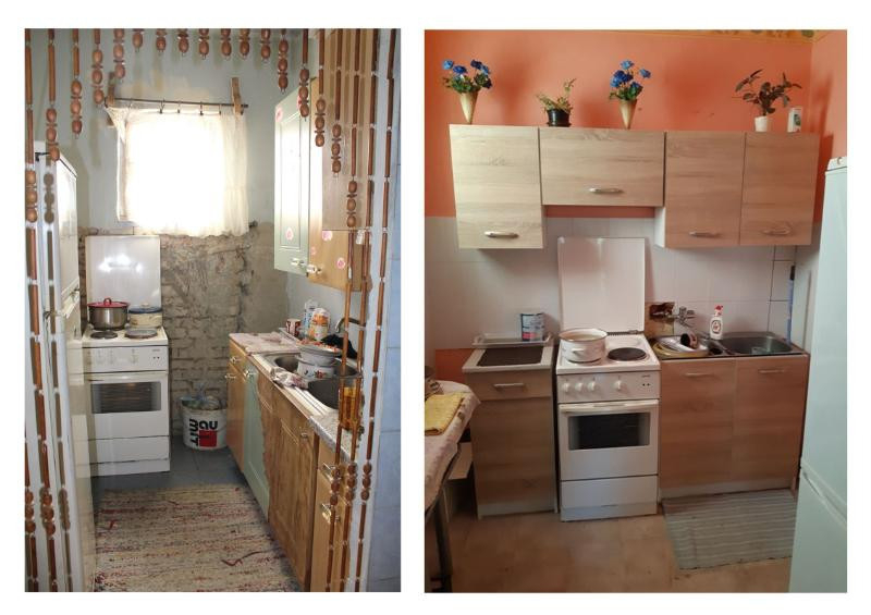 A másik, kistelepülésen élő család már régóta szerette volna családi házát rendbe tenni. A kert az ott lévő hulladék miatt nem volt művelhető. A Karitász konténert rendelt, így sikerült a hulladékot elszállítani a nyáron. A család a harmadik gyermek érkezése előtt különösen örült a tisztasági festésnek és a tisztítószereknek, emellett a konyha felújításához csempét, csemperagasztót, fugázó anyagot kapott a szervezettől. A támogatott család tagjai folyamatosan tesznek lakókörnyezetük szépítéséért, amit saját kétkezi munkájukkal tudtak, elvégeztek a felújítás során, és anyagi lehetőségeikhez mérten jelentős önerőt is hozzátettek: vakolóanyagot vásároltak konyhájuk elkészítéséhez. A régi, széteső konyhabútort a Karitász támogatásával új bútorra cserélték.