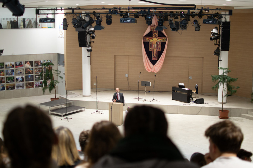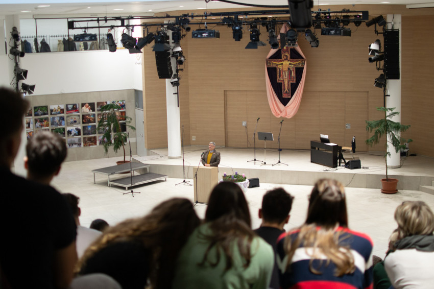 A vendégeket Szalai Gábor, a Szent Angéla Ferences Általános Iskola és Gimnázium igazgatója köszöntötte: elsőként Berhidai Piuszt, a Magyarok Nagyasszonya Ferences Rendtartomány provinciálisát, az iskola fenntartójának képviselőjét; Kuzmányi Istvánt, a Magyar Kurír főszerkesztő-igazgatóját, a fotósokat, művészeket, az érdeklődő vendégeket, továbbá a felsős és gimnazista diákokat, kollégákat, munkatársakat. Kiemelte, hogy az új aulát közösségi térnek szánták, amely a világra is nyitott, ahová eseményeket hívhatnak, és ahol rá lehet csodálkozni, „mit kínál számunkra az Egyház”.