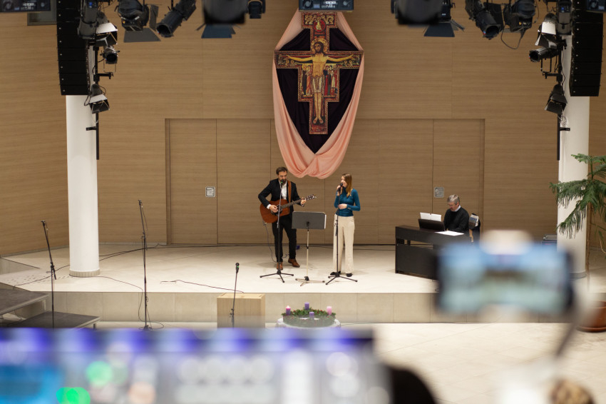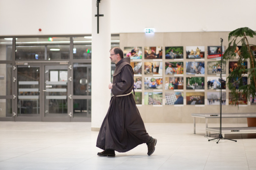 Sokszor érezzük magunkat lelkileg szürkének, ködösnek akár egy egyházi eseményen is, mint amilyen a mai időjárás – folytatta. – Mi kell ahhoz, azaz inkább ki kell ahhoz, hogy ez változzon? A ti jelenlétetek kell – hangsúlyozta, majd elmondta, hogy Gál Emília a kiállítás plakátjának éppen azt a képet választotta ki, amikor egy lány egy Forráspont-rendezvényen felnéz, és rávetül a fény. „Zita elkapta a fényképezőgépével ezt a gyönyörű pillanatot, de ehhez az kellett, hogy ő és a fiatal is éppen akkor ott legyen.”