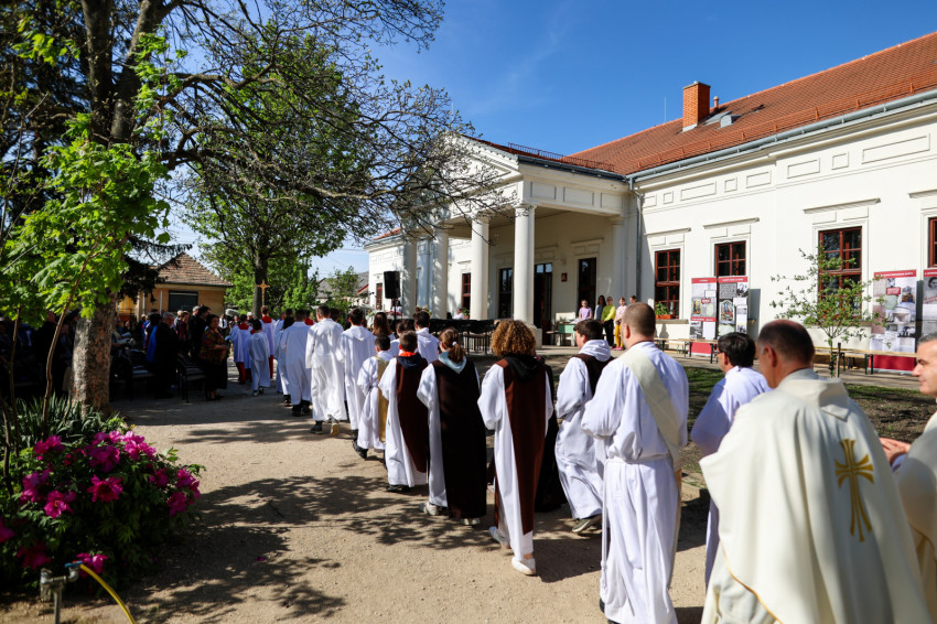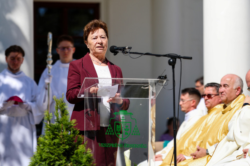 10 órakor bevonult a Veszprémi Főegyházmegye harminc papja az iskola udvarán tartott szabadtéri szentmisére, amelyre több száz ember gyűlt össze.