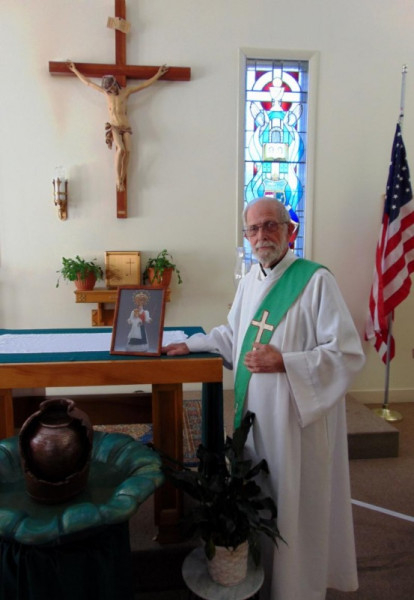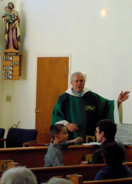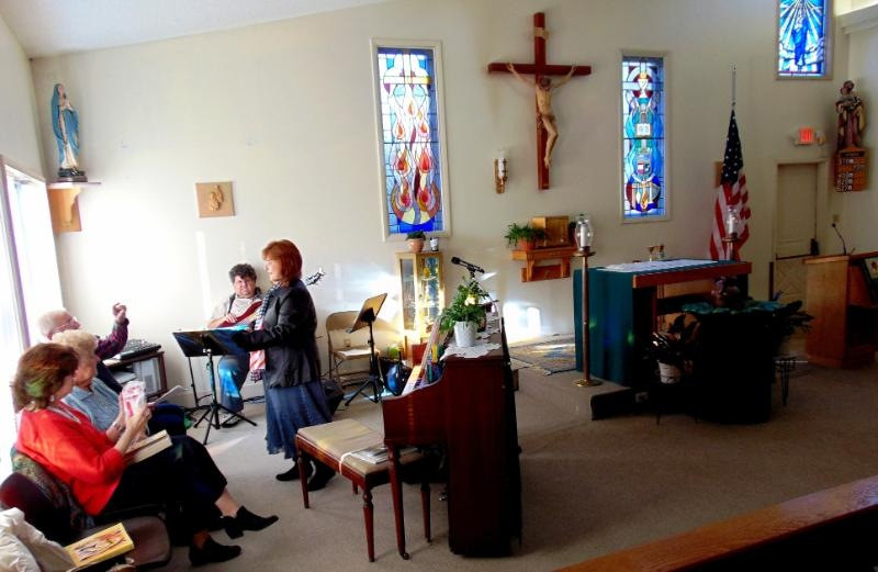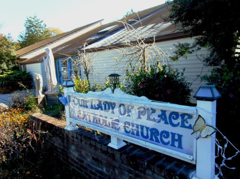 Ilyen kellemes előzmények után került sor november 11-i látogatásomra az appomattox-i Our Lady of Peace római katolikus templomban. Jóval a korai, fél kilences mise előtt érkeztünk meg vendéglátóimmal a modern, egyszerű stílusban épült templomba. A plébános, James Gallagher bemutatásomkor szeretettel üdvözölt, majd elfoglaltuk helyeinket a hátsó padsorok egyikében. Érdeklődéssel néztem körül a szerényen, vallásunkra jellemző, ismerős tárgyakkal berendezett templomban. Jim atya felhatalmazásával a mise kezdetéig szaporán kattogtattam fényképezőgépemet. Nekem szokatlannak tűnt, hogy kis zenekar foglalt helyet a mindössze egy asztalból álló oltár mellett.