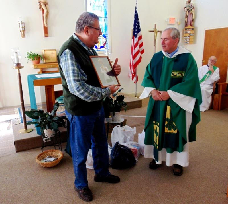 A szertartás a mi misézésünkhöz hasonlóan zajlott. Jim atya szolgálatát a diakónus és a kis zenekar segítette. A mise végén az atya arra kért, menjek ki mellé. A közösség előtt újból üdvözölt és röviden méltatta a tábornokommal közös misszióban végzett tevékenységünket. Rövid válaszomban megköszöntem, hogy azon a szép vasárnap délelőtt együtt lehetek a közösséggel, külön megköszönve vendéglátóim meghívását. Végezetül, már könnyeimet nyelve, felolvastam a Mária-kép hátoldalára, a hívek részére írt dedikációmat, és – mint Bíró püspök úr a kép megáldásakor – elmondtam az Üdvözlégy Máriát magyarul. Végezetül testvéri öleléssel átadtam a képet, amelyet meglepetésemre az atya az oltárra állított.