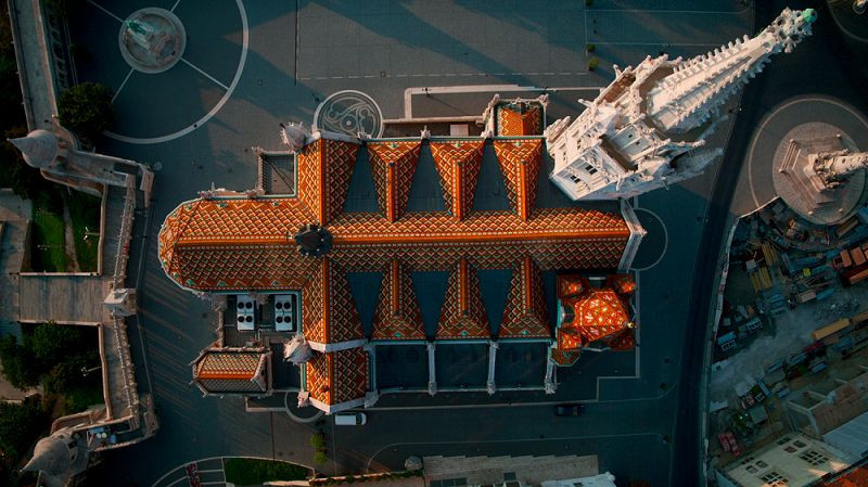 Madártávlatból láthatjuk a Zsolnay-kerámiával fedett hatalmas épületeket; a századforduló évtizedeiben a Zsolnay építészeti kerámia meghatározó jelentőségűvé vált Budapesten és vidéken is. Ilyen kerámia borítja például a Mátyás-templom tetejét, a Szilágyi Dezső téri templomot, a Szent László-templomot vagy a Magyar Állami Földtani Intézetet is.