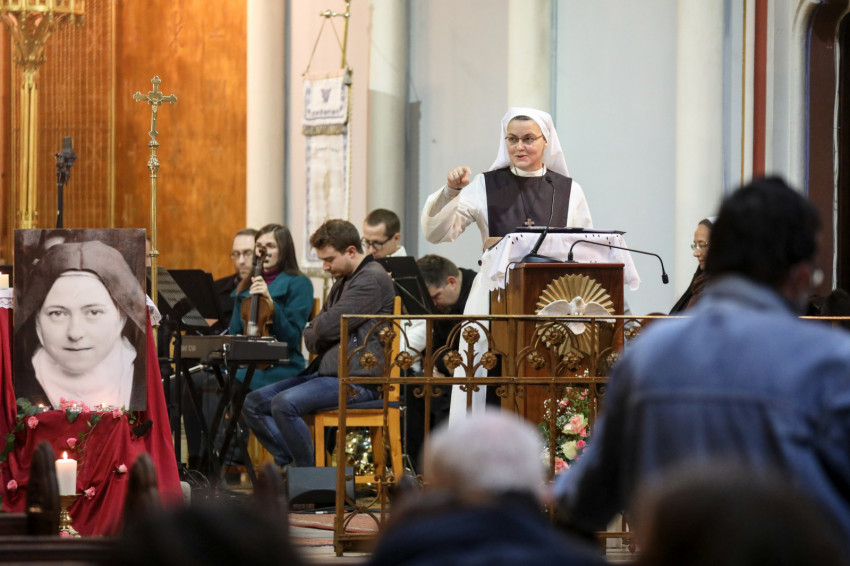 „Szeretni szüntelenül / Elégni szeretetből / Így oszd szét mindenedet / Légy maga a szeretet” – hangzott a Nyolc Boldogság Közösség zenekarának és énekkarának előadásában Lisieux-i Szent Teréz versének refrénje, lágy franciás dallammal és harmóniákkal. Az imaesten megzenésített verseit, levelezésének és önéletírásának részleteit is hallhattuk.