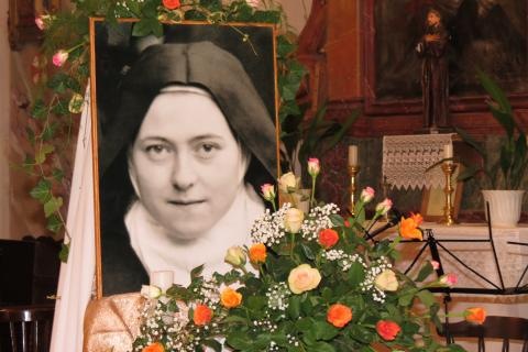 Sára nővér köszöntőjében kiemelte a kármelita szent életének néhány eseményét: Az öt lánytestvérnek, akik később mind szerzetesnővérek lettek, át kellett élniük édesanyjuk korai halálát – Teréz ekkor négyéves volt. Kilencévesen olyan beteg lett, hogy az orvosok lemondtak róla, mígnem Mária mosolya, melyet a lelkében élt át, meggyógyította. Teréz 24 évesen halt meg, XI. Piusz 1925-ben szentté, II. János Pál pedig 1997-ben egyházdoktorrá avatta. A Nyolc Boldogság Közösség védőszentjeként tiszteli a kicsiségét nagyra értékelő francia szentet.