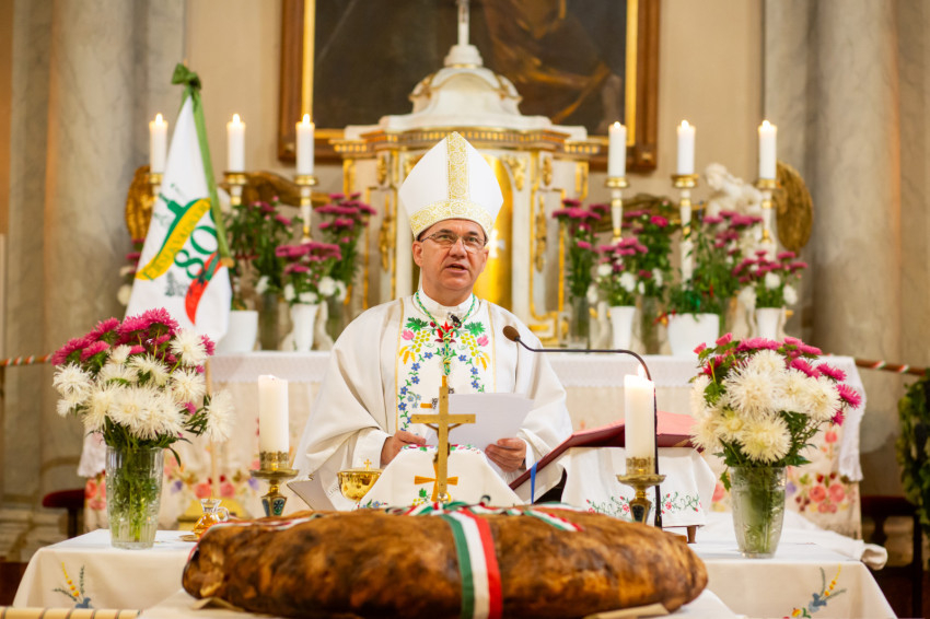 Végül Marton Zsolt megáldotta azt az 50 kilogrammos kenyeret – melyet Szolnokon sütöttek az ünnepre az érsekvadkertieknek – és a többi terményt.