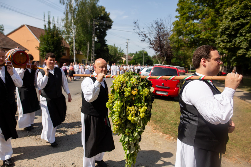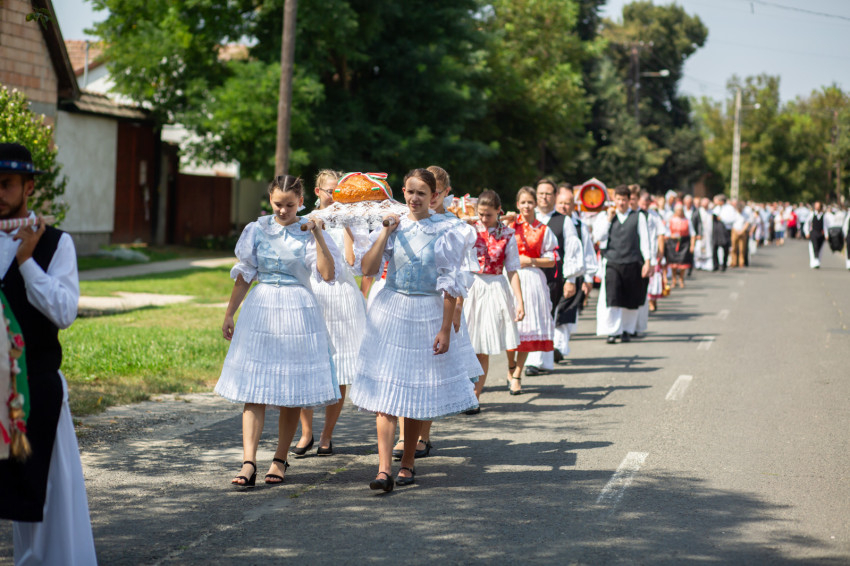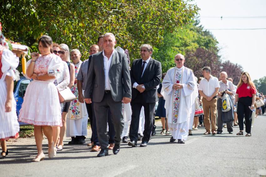 A szentmisét követően indult a körmenet. Aki tehette, népviseletben kísérte a kenyeret, kalácsot, a terményekből összeállított kompozíciókat. Elöl vitték a keresztet, mögötte virágból készült rózsafüzérrel lépkedtek a gyerekek, majd következtek az ételek, egy hordó bor és gyümölcskompozíciók.