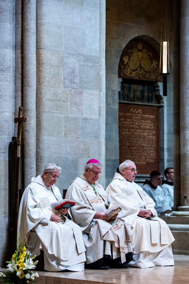 A jubiláns szerzetesek: az aranymisés Várszegi Asztrik püspök, emeritus főapát és az ugyancsak ötvenéves papi szolgálatát ünneplő Kiss Domonkos; a vasmisés Lövey Félix, a gyémántmisés Csóka Gáspár és az ezüstmisés Rainer Nagel.
