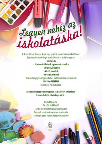 Szeretettel várnak tárgyi felajánlásokat: iskolatáskát, füzeteket alsó és felső tagozatos diákok számára, tolltartókat, írószereket, körzőket, vonalzókat, tornafelszereléseket. Emellett az anyagi támogatást is örömmel veszik.