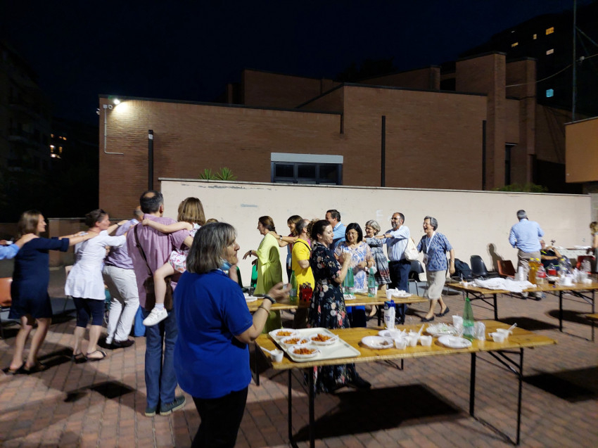 Csütörtök este különböző római plébániák látták vendégül a küldötteket. Minket, magyarokat a portugálokkal, a mozambikiakkal, egy Máltáról és egy Milánóból érkezett házaspárral együtt a tiburtinai Szent Romano mártír plébánián fogadtak sok szeretettel. A leginkább az Óbudai lakótelep környékére emlékeztető egyházközösségbe zömében Dél-Olaszországból származó hívek járnak. A plébániát egy chilei atya vezeti, aki Afrikába szeretett volna menni misszionáriusnak, helyettese Haitiről származik. Olasz és angol nyelvű programmal készültek, egy kis imádsággal, énekléssel és finom itáliai falatokkal. A portugálok, a mozambikiak, sőt még mi is dalra fakadtunk, aztán az O sole mio és más dalok is felcsendültek a plébános jóvoltából, úgyhogy a tánc nemzetközi nyelve is összekötötte a pünkösdi hangulatú esemény résztvevőit.