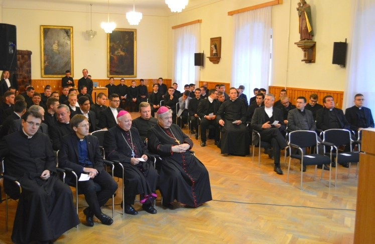 „A kutyát és a papot a szájáért tartják!” – idézte a népi mondást Vik János dékán köszöntőjében. Azzal kapcsolatban, hogy mi értelme ma hittudományt művelni, kifejtette, hogy mindamellett, hogy a papszentelés feltétele a teológia művelése, fontos, hogy a papságra készülők ne csak „papoljanak”, avagy kioktassanak, mondanivaló nélkül beszéljenek, hanem a jó emberismerő kutyához hasonlóan megtanuljanak figyelni, hallgatni. Hangsúlyozta, a papságra készülők célja nem a népszerűség, hanem az, hogy emberközeliek legyenek. A teológia tanulása a figyelmes hallgatásra képezze a kispapokat, hogy majd a rájuk bízottak merjenek elindulni, megkeresni saját személyes válaszukat életük nagy kérdéseire. Ábrahám alakját állította a növendékek elé, aki az ígéret után indult útnak. Mindannyiunknak küldetése van a világban, hogy azt alakítsuk, szebbé tegyük. Utunk célja, hogy megérkezzünk Istenhez, aki mindig nagyobb a mi félelmeinknél, a szenvedéseknél, amik ránk várnak – fejtette ki a dékán.