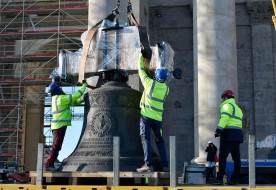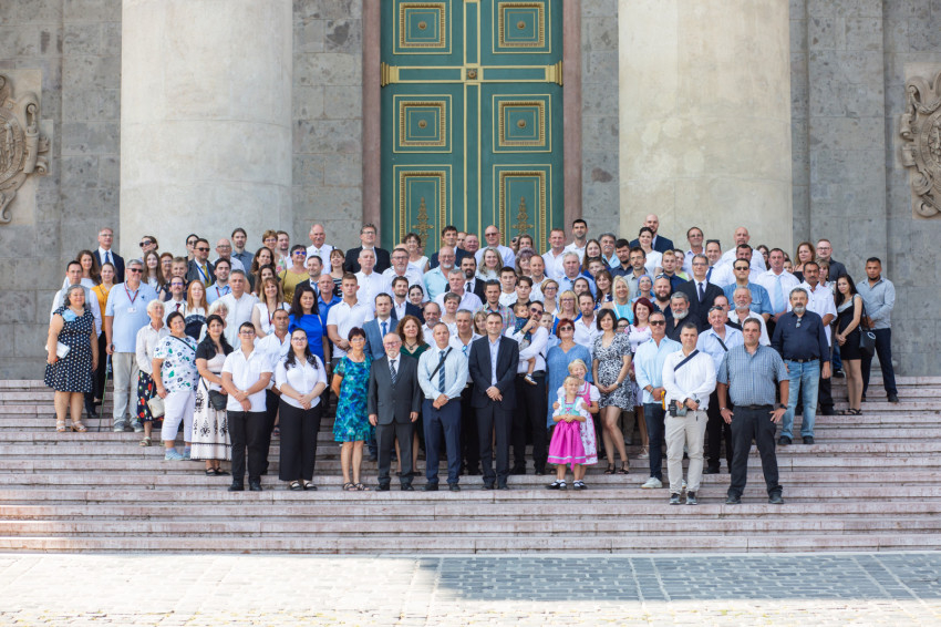 A szentmise végén a főbejárat lépcsőjén közös fotó készült a felújításban részt vevő 150 munkatárssal.
