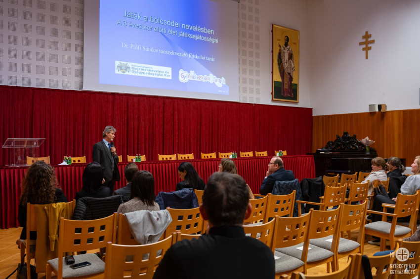 Az ünnepség a Szent Atanáz Görögkatolikus Hittudományi Főiskolán folytatódott. A szakmai alapvetéseket Pálfi Sándor, a Debreceni Egyetem Gyermeknevelési Gyógypedagógiai Kar Gyermeknevelési Tanszék tanszékvezető főiskolai tanára, dékáni referens mondta el Játék a bölcsődei nevelésben – a 3 éves kor előtti élet játéksajátosságai című előadásában.