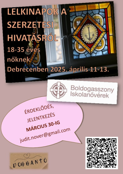 A Boldogasszony Iskolanővérek szeretettel várják 18 és 35 év közötti szabad állapotú, katolikus hitüket gyakorló nők jelentkezését, akiket foglalkoztat a szerzetesség gondolata. A bentlakásos lelki hétvége április 11-én, pénteken 18 órakor kezdődik, és április 13-án fejeződik be, legkésőbb 15 órakor.