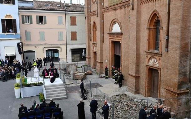 „Kedves testvérek! Városotokban, amely még láthatóan magán viseli a súlyos megpróbáltatás jeleit, szeretnélek átölelni benneteket és a 2012-es földrengés által sújtott többi helység lakóit” – kezdte beszédét a Szentatya. Felidézte, hogy XVI. Benedek pápa néhány héttel a földrengés után ellátogatott e térségbe, hogy kifejezze szolidaritását és bátorítását a maga és az egész Egyház nevében.