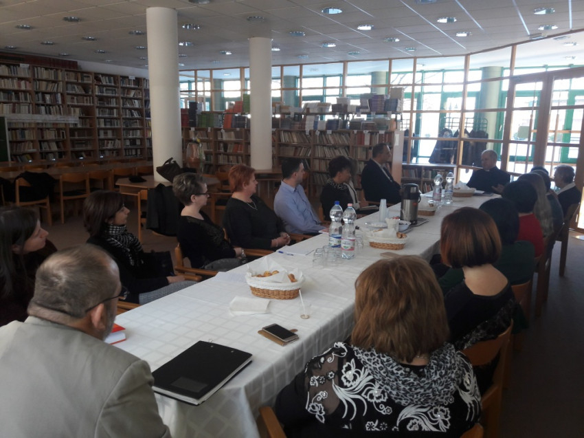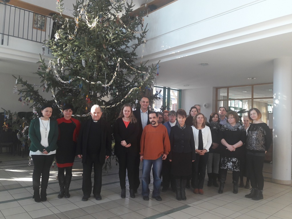 Tóth Mária kirendeltségigazgató és Késmárki Zsolt, az SZGYF Főigazgatói Irodájának témafelelős munkatársa vezetésével azért gyűltek össze előadásra és kötetlen beszélgetésre, hogy megosszák tapasztalataikat munkájukról, meghallgassák a főpásztor gondolatait az Egyház szociális-társadalmi szerepvállalásáról, annak konkrét megvalósulási formáiról a megyében, számos személyes epizóddal, lelkipásztori élménnyel illusztrálva.