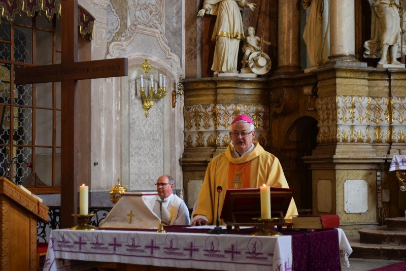 Spányi Antal püspök szentbeszédében rávilágított: Gyümölcsoltó Boldogasszony, Mária Istennek mondott igenjének ünnepnapja Isten örök szeretetéről, megbocsátó nagyságáról tanít minket, amire nekünk is szükségünk van. Így tudjuk építeni Isten országát mindazoknak a szívében és lelkében, akik látják tanúságtételünket. Mária igenje rejtve történt, egyszerű esemény volt, amiről senkinek sem volt tudomása. Az eseményt, ami meghatározó lett az egész emberiség történelmében, imádságra nyitott lelkében élte meg titokban, csöndben. Amit az ember lerombolt a bűnnel, annak ott kezdődött meg a helyreállítása. Isten emberiségről alkotott terve nem hiábavaló.