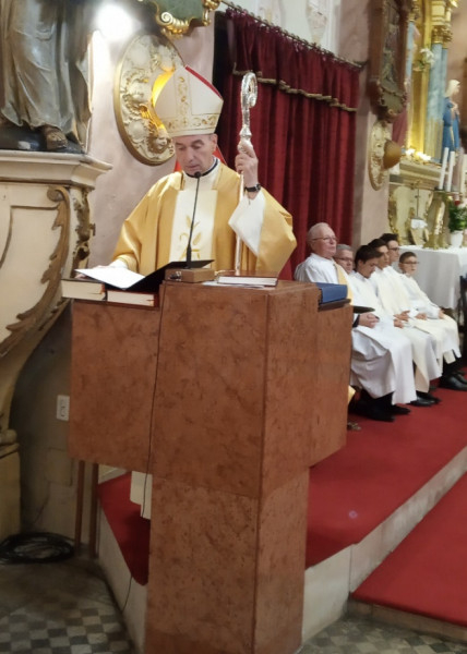 Homíliájában az érsek Rózsafüzér Királynőjéről, a Boldogságos Szűz Máriáról beszélt, aki mindvégig tudta, hogy gyermeke az Isten Fia. Udvardy György rámutatott: Mária folyamatosan elmélkedett a gyermekéről, így folyamatosan tárult fel előtte Isten titka. Ahogy a gyermek fejlődött, úgy fejlődött Mária is a hitében. Jézus halála, feltámadása és mennybemenetele után Mária körül akart mindenki összegyűlni, hogy tanítsa őket imádkozni. Amikor a rózsafüzért imádkozzuk, mi is együtt imádkozunk Máriával.