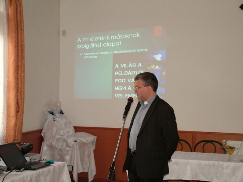 Beszédünk által: hiszen a jó szó, a meleg tekintet gyógyszer a szív számára – idézte Papp Lajos szívsebészt. Helyet és teret kell adni bizonyos dolgok megbeszélésére. Cselekedeteink által: a pedagógus belülről fakadó pontosságának igénye, rendezettsége, ápoltsága legyen természetes és tündöklő. Életformánk által: az atya rávilágított a pedagógus saját maga iránti őszinteségének, az emberi hangnak és a megbocsátásnak a fontosságára. Az egyház a legemberbarátabb fenntartó – emlékeztette a kollégákat.