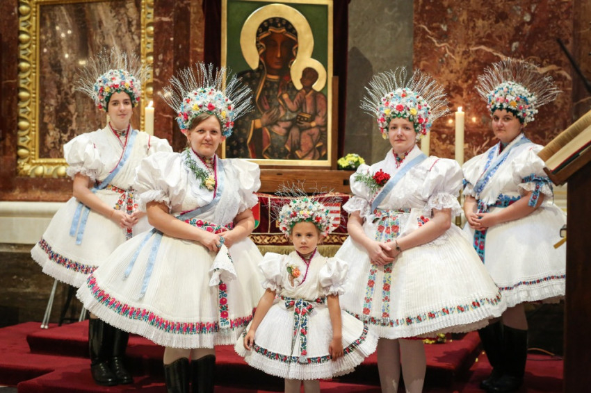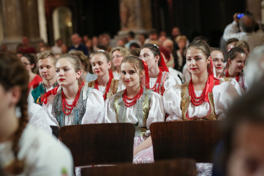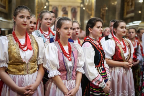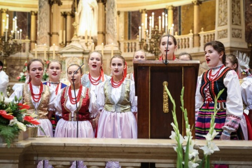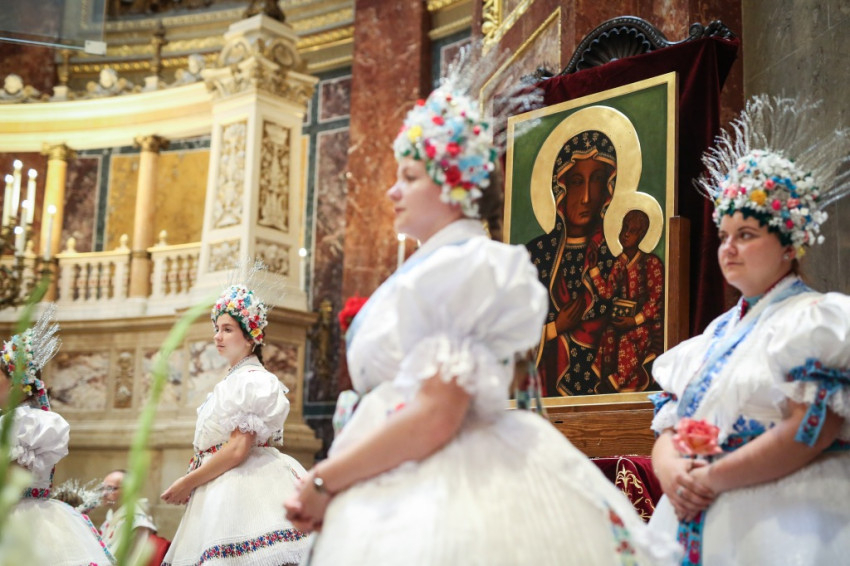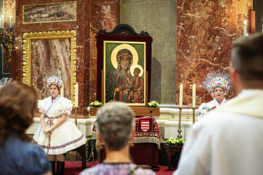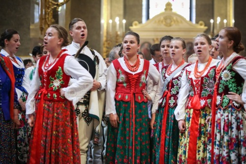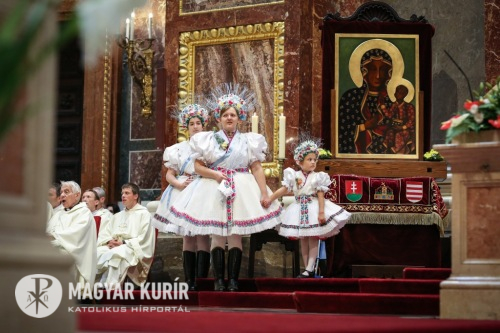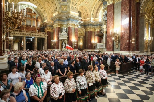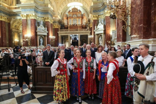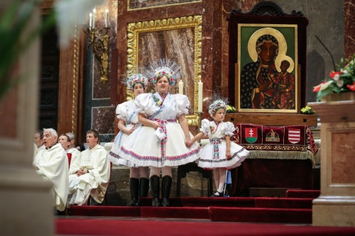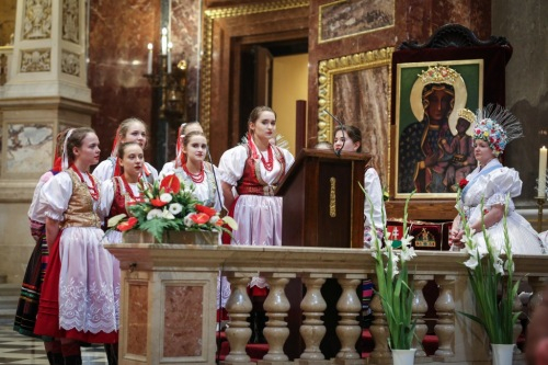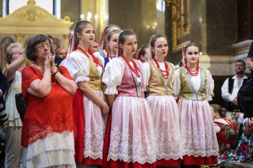 A bazilika már jóval a szentmise előtt zsúfolásig megtelt lengyel és magyar zarándokokkal, hazánkban élő lengyelekkel, hazájuk különböző tájegységeinek népviseletébe öltözött fiataljaival, akik imádságukkal, énekükkel köszöntötték a Szűzanyát.
