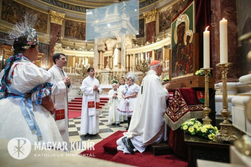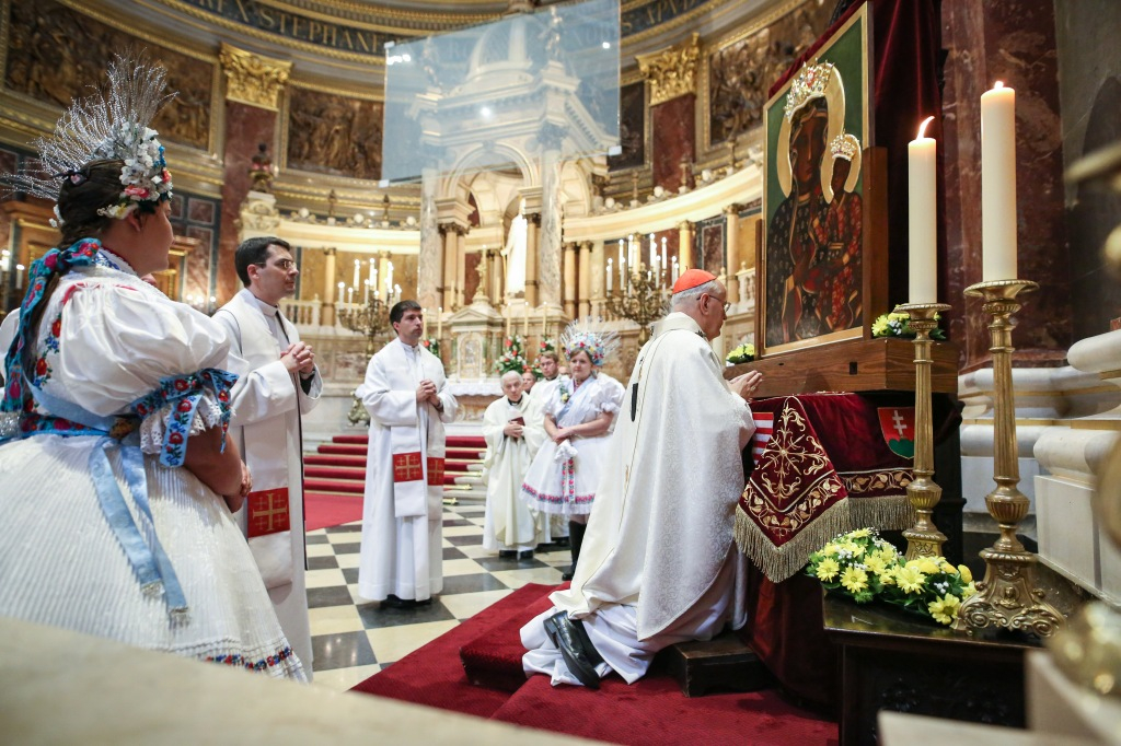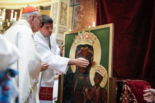 A szentbeszédet követően került sor az oltár mellett a virágokkal díszített kegyképmásolat megkoronázására, ezután Erdő Péter bíboros imádkozott előtte, miközben a Fekete Madonnához szóló hagyományos lengyel egyházi énekkel köszöntötték a jelenlévők a Szűzanyát.