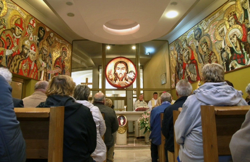 A kápolnában bemutatott mise szentbeszédében Márfi Gyula érsek az isteni irgalmasságot párhuzamba állította a szeretet fogalmával. Az irgalmasság testi cselekedeteinek gyakorlásával a három szeretetfajta – erosz, fília, agapé – közül az agapét, a legmagasabb rendű szeretetet gyakorolhatjuk. Innen a Szent II. János Pál-templomba vezetett a zarándokok útja, amelyet 2013. június 23-án szentelt fel II. János Pál pápa volt titkára, Stanisław Dziwisz krakkói érsek. A templom a „Ne féljetek!” II. János Pál Központ épületegyüttesének a része. A papi kápolnában helyezték el az eredeti sírkövet, amely a lengyel pápa sírját fedte a római Szent Péter-bazilikában. A falakat mozaikok díszítik, amelyeket egy szlovén jezsuita szerzetes, Marko Ivan Rupnik tervezett.