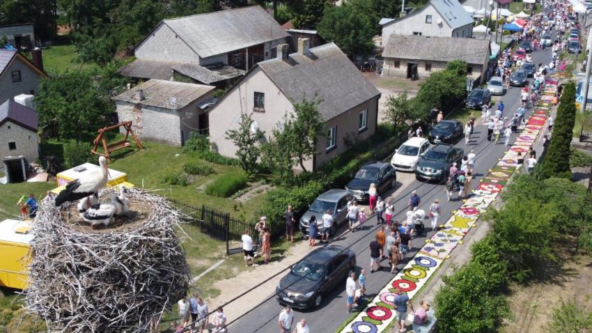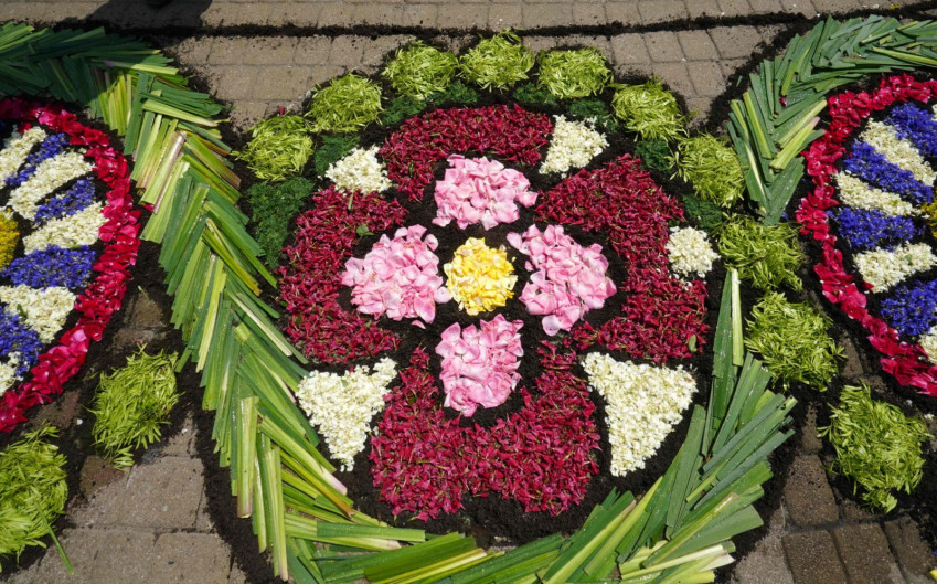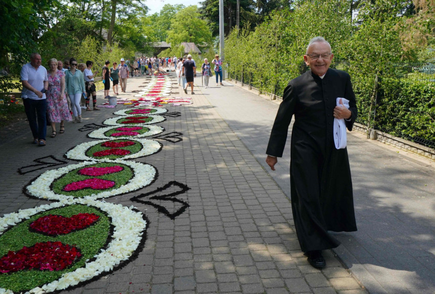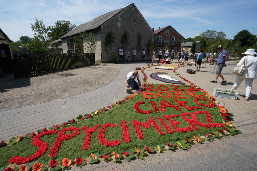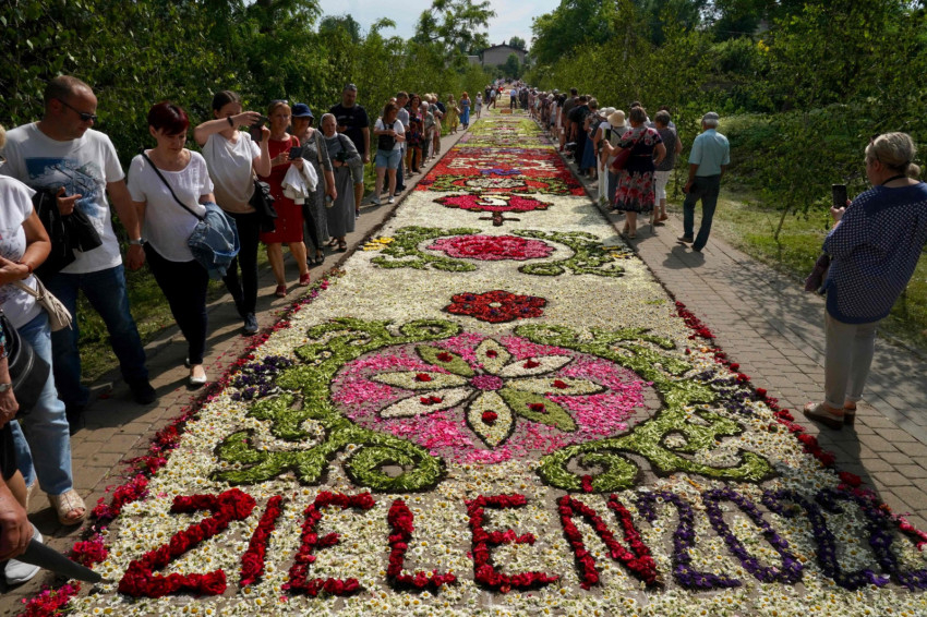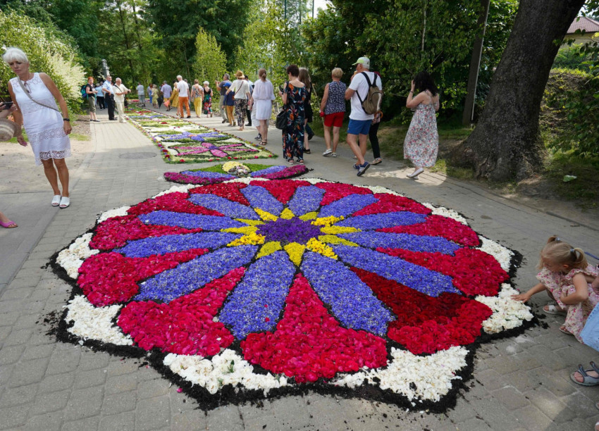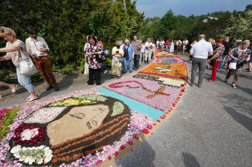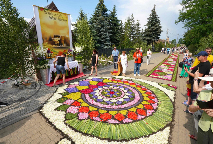 Lengyelországban különösen nagy, közös és máig elterjedt hagyománya van a színes virágszőnyegek készítésének is, részint a templomokban, illetve a városok és falvak utcáinak bizonyos szakaszain. Lengyelország leghíresebb virágszőnyegei a közép-lengyelországi Spycimierzben készülnek. Itt a virágszőnyeg hossza sokszor eléri az egy kilométeres távolságot, a színpompás virágsziromképek bibliai jeleneteket és szentek arcképeit ábrázolják.