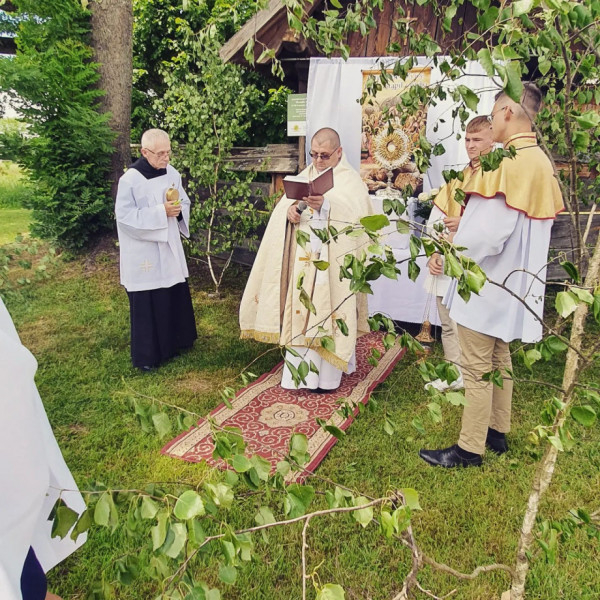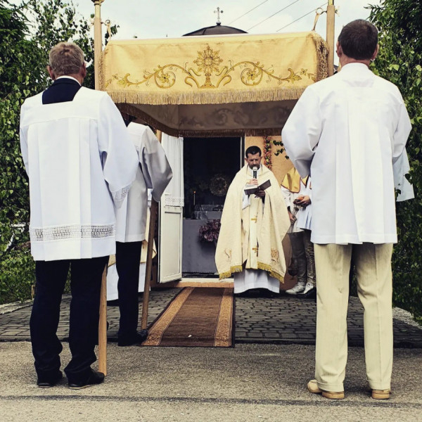 A baldachin körül a fiú ministránsok haladtak, kezükben templomi csengettyűkkel, melyek hangjára a körmenet szélén állók vagy éppen arra haladók éppúgy letérdeltek, mint a szentmiséken úrfelmutatáskor. A körmenetet sokfelé a helyi fúvószenekarok és templomi kórusok követték. A processzió a nyírfaágakkal és virágokkal feldíszített, a négy égtájat jelképező négy oltárnál mindig megállt, a pap pedig az evangéliumi szakaszok felolvasását követően imádságot mondott. A körmenet végén a résztvevők lengyel szokás szerint az áldás jeléül hazavitték az oltárok nyírfagallyait, amelyeket otthon szántóföldjeik partjára és kertjeik ágyásaiba tűzdelnek, hogy ezáltal is Isten áldását kérjék a jó termés reményében.