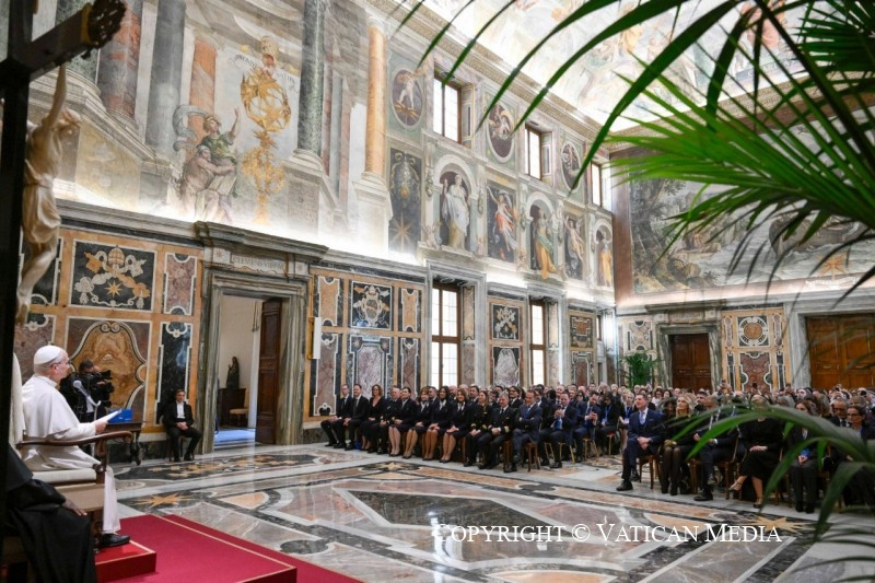 Elődeim és a nemzetközi utakon az őket kísérő munkatársak az Alitalia és az ITA Airways személyzetében nemcsak képzett és tapasztalt szakembereket találtak, hanem olyan embereket, akik képesek nyugodt, szinte családias légkört teremteni, ahol a tisztelet hitbéli odaadással párosul – fogalmazott Leó pápa. – Az Önökkel való találkozás lehetőséget ad arra, hogy kifejezzem személyes elismerésemet és hálámat, valamint a Szentszék háláját ezért a felbecsülhetetlen értékű szolgálatért.