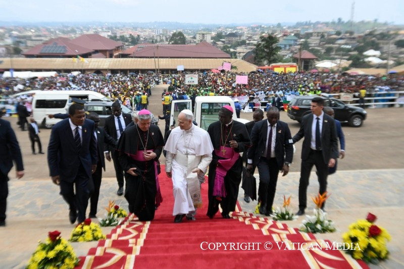 A bevonulási ének után Andrew Nkea Fuanya, Bamenda érseke köszöntötte a Szentatyát. Ezután tanúságételek következtek: beszédet mondott IV. Fon Fru Asaah Angwafor, Mankon hagyományos legfőbb királya; Fonki Samuel Forba püspök, a kameruni presbiteriánus egyház nyugalmazott vezetője; Mohamad Abubakar imám, a Buea Central Mosque képviseletében; Carine Tangiri Mangu nővér, a Szent Anna Kongregáció tagja, valamint egy belső menekült család: Denis Salo, felesége és három gyermekük.