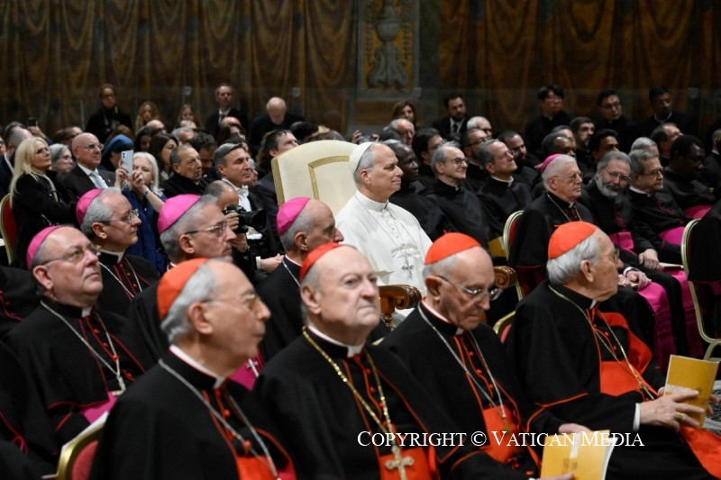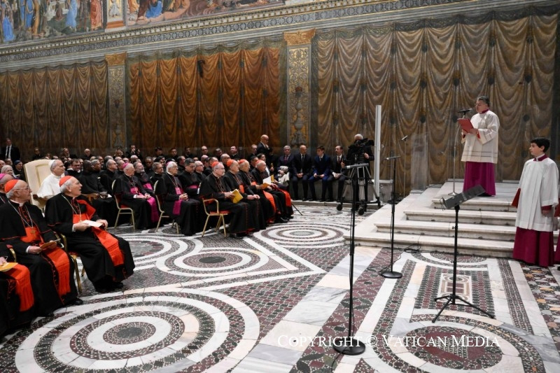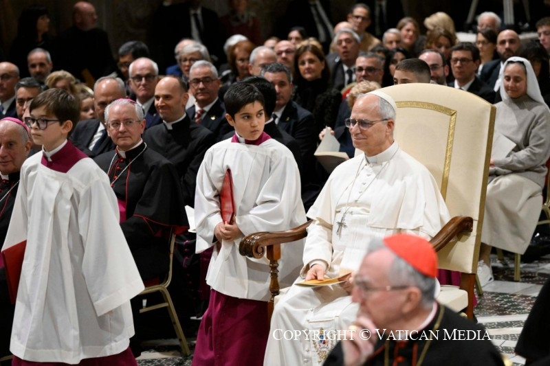 A pápának a rendezvény végén a résztvevőkhöz intézett szavai szerint a karácsonyi elmélkedés a „zene és az ének nyelvén” is megnyilvánul, amely képes mind az elméhez, mind a szívhez szólni. Ezt fejezte ki a több mint 1500 éves múltra visszatekintő kórus, amelyet Marcos Pavan prelátus, karmester vezényelt Michele Marinellivel együtt, aki a Pueri Cantores, az ifjúsági kórus karmestere. XIV. Leó pápa beszédében köszönetet mondott mindkettőjüknek.