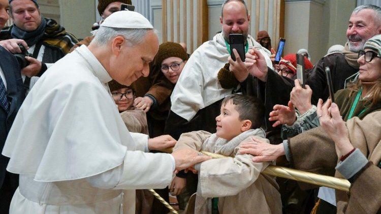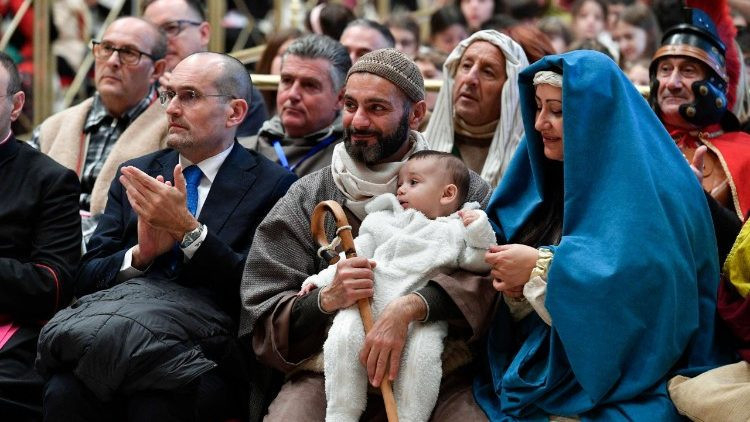 A bazilika élő betlehemi jelenetének résztvevőit fogadva a Szentatya emlékeztetett: a csoport tagjai a világ minden részéről érkeznek, hogy meglátogassák Szent Péter sírját.