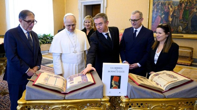 XIV. Leó pápa tavaly december 18-án látogatást tett az olasz szenátusban, a szentév végén rendezett kiállításon. Ezért Ignazio La Russa, a szenátus elnöke és Federico Toniato főtitkár, valamint az Este-galéria igazgatója, Alessandra Necci elhozták a Bibliát a Vatikánba, mielőtt visszavitték volna Modenába, ahol az Este Egyetemi Könyvtárban őrzik.