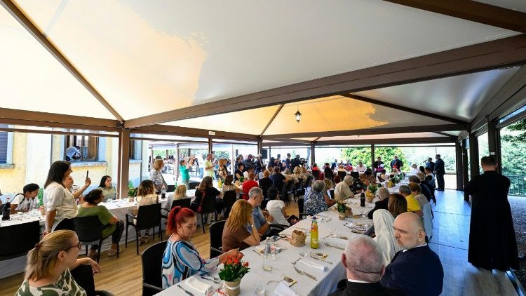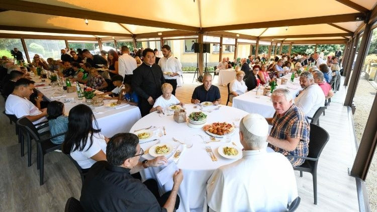 Nagyon köszönöm mindannyiatoknak, akik itt vagytok. És most kérjük az Úr áldását az ajándékokra, amelyeket kapunk, és mindazokra, akik dolgoztak azon, hogy elhozzák nekünk ezt az ebédet, az ajándékokat, amelyeket megosztunk – a Borgo Laudato si’ és sokan mások –, akik lehetővé teszik ezt a szép ünnepet.