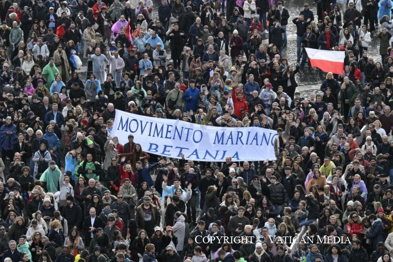 Köszöntöm az ercolanói Puglianói Szűzanya-Oratórium csoportját, a Postomiából és Porcellengóból érkezett családokat és lelkipásztori munkatársakat, Sant’Antonio Abate, Torano Nuovo és Collepasso híveit; továbbá a sant’arpinói Rocco-Cinquegrana Intézet tanárait, a modenai és Roccella Jonica-i tartomány cserkészeit, Ula Tirso, Neoneli és Trescore Balneario bérmálkozóit.