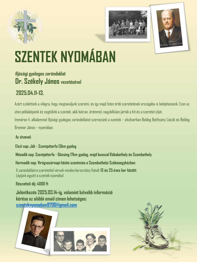 A Szombathelyi Egyházmegye szeretettel hív minden 13 és 25 éves kor közötti fiatalt a „Szentek nyomában” mottóval meghirdetett közös zarándokútra április 11–13. között.