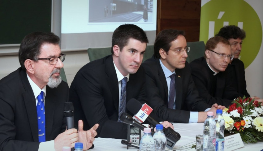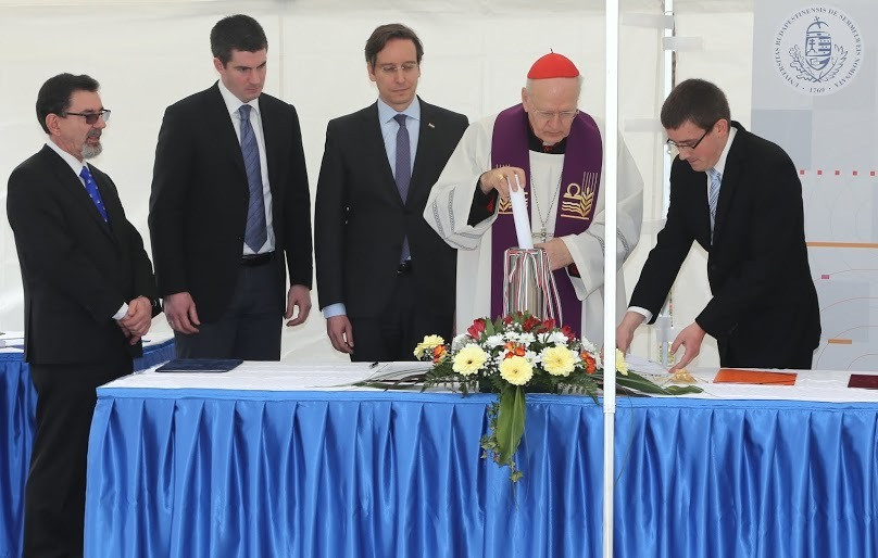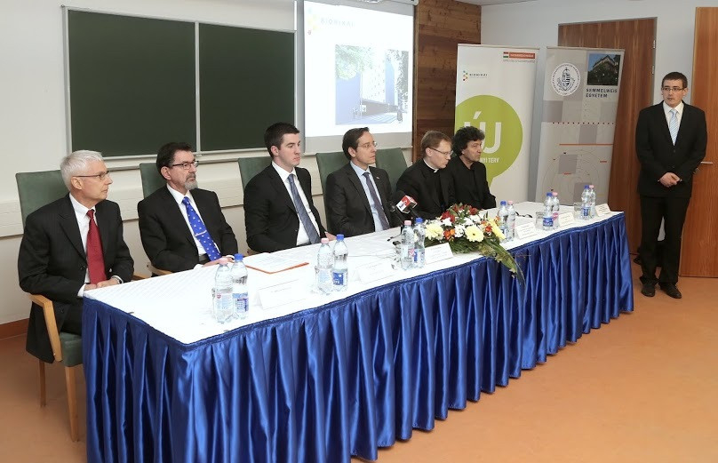 Szuromi Szabolcs rektor az egyetem tudományos kapcsolatrendszerére irányította a jelenlévők figyelmét, amely nemcsak a különböző európai és egyesült államokbeli intézményekkel jön létre (így például a PPKE kapcsolatot tart fenn a krakkói Jagelló Egyetemmel, a spanyolországi Universidad de Navarrával és az indianai Notre Dame Egyetemmel is), hanem a leendő központ és a benne megvalósuló kutatások között is. Hiszen, amint hangsúlyozta, a tervek szerint olyan épület átadására kerülhet majd sor, amely lehetővé teszi a folyamatosan változó, multidiszciplináris tudományterület alakulásának követését is.