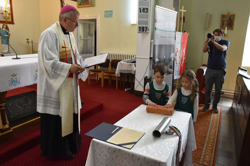 Böcskei László – rögtönözve – két óvodás „segítségét” kérte az alapkő megáldásához. Ez nem egy közönséges kődarab, hanem egy tégla, amely a székesegyház falából származik, és jelképe annak, hogy elődeink építő munkáját folytatjuk, azokét, akik egykor megalapozták és felépítették mostani intézményeinket.
