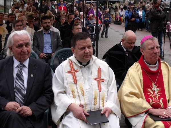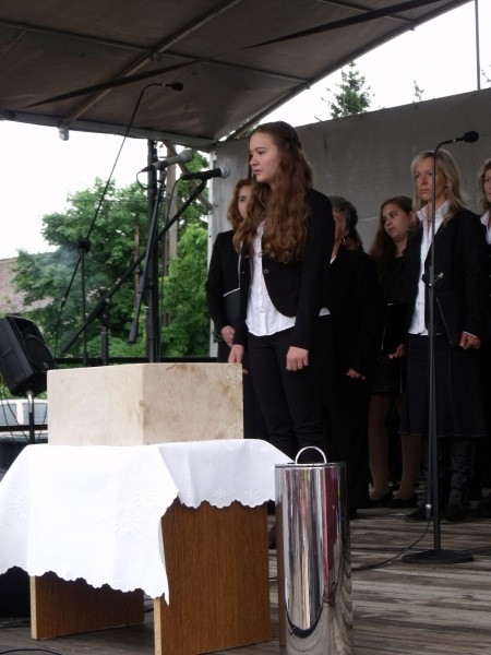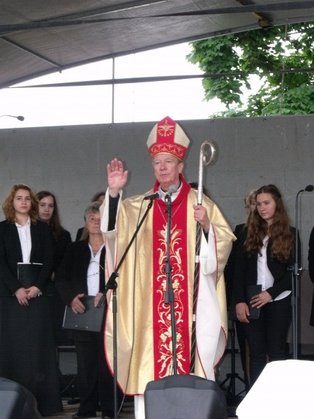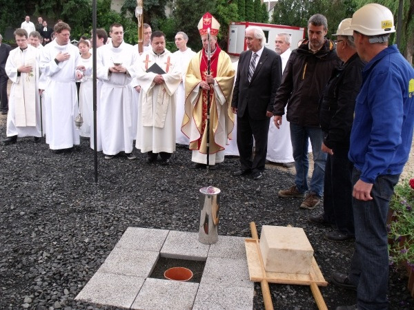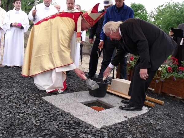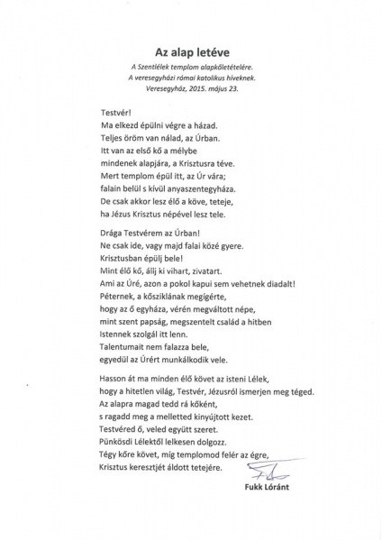 „Pünkösd előtt vagyunk, alapkövet teszünk le, és bennem ez a kettő összekapcsolódik – fogalmazott Beer Miklós megyéspüspök –, mert mindkettő a jövőről szól: szent kezdet. Kezdete annak a jövőnek, amelyet Isten jól ismer, mi azonban még nem, és a mi Istenünk mégis ránk bízza. Ezekben a percekben százezrek vannak együtt Csíksomlyón. Hozzájuk csatlakozunk mi is itt, új templomunk alapkövénél. Igyekszünk megérteni, hogy nekünk, magyaroknak milyen fontos szerepet szán az Isten a mai, menekültektől ellepett, új útját kereső Európában. Nekünk, magyaroknak kell megmutatni, hogy igenis lehetséges békében, szeretetben, egymást segítve élni a mai világban.”