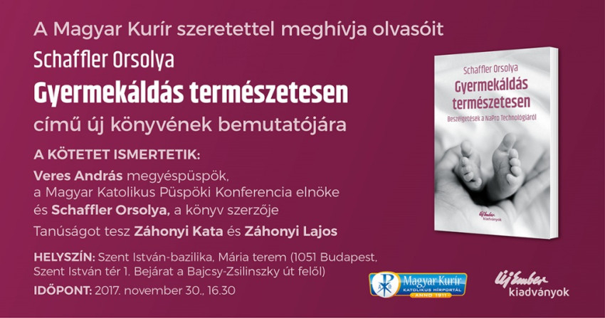 A Magyar Kurír gondozásban, az Új Ember Kiadványok sorozatban jelenik meg Schaffler Orsolya Gyermekáldás természetesen című könyve, mely a NaPro Technológiát ismerteti. A kötetet november 30-án, csütörtökön 16.30 órakor mutatjuk be a budapesti Szent István-bazilika Mária termében (bejárat a Bajcsy-Zsilinszky út felől). A belépés díjtalan.