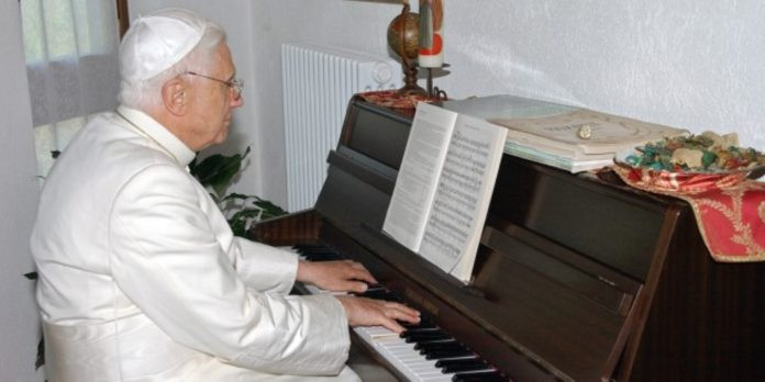 Számára a zene, a nyugati zene a kereszténység erejét és szépségét mutatja, minthogy a hitélményben gyökerezik – ahogy ezt a díszdoktori cím átvételekor mondott beszédében hangsúlyozta. (2015-ben Krakkóban doctor honoris causa kitüntetést kapott a II. János Pál Pápai Egyetemtől és a krakkói Zeneakadémiától.) XVI. Benedek szerint a különböző kultúrák és vallások a zene álal jobban tudnak találkozni, mint a szavak szintjén. Mert minden nagy alkotásban – szépirodalmi, képzőművészeti, építészeti, zenei jellegű alkotásban – zeneiség is rejlik. Palestrina, Bach, Händel, Mozart, Beethoven, Bruckner munkássága a művészet csúcsát jelenti. S bár nem minden zenei alkotás íródott kifejezetten vallási, egyházi célra, a zene lényege a liturgiában gyökerezik; kiindulópontja az Istennel való találkozás. Ez Bach műveiben egyértelműen megmutatkozik, aki számára Isten dicsősége a zene végpontja. Isten mindannyiunkkal találkozik a liturgiában, jelenvalóvá tette magát az ember számára Jézus Krisztusban. A ma 93 éves emeritus pápa szerint ez a zene az igazi kereszténységet jeleníti meg.