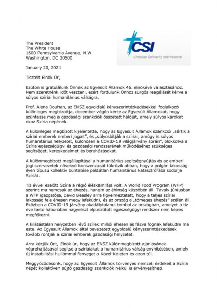 Világszerte több mint kilencven vezető szólította fel Joe Biden amerikai elnököt, hogy oldja fel azokat a gazdasági szankciókat, amelyek megölik, elűzik, nyomorba döntik és más módon sértik Szíria lakosságát – adta közre Christian Solidarity International (CSI) keresztény emberi jogi szervezet magyar képviselete. Az összefogás alapját Alena Douhan, az ENSZ egyoldalú kényszerintézkedésekkel foglalkozó különleges megbízottjának jelentése adta.