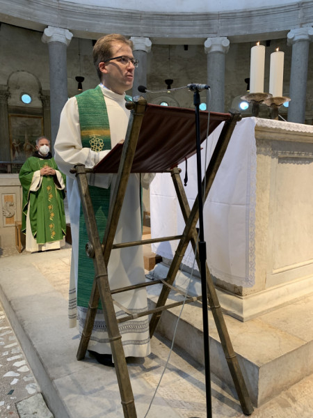 A szentmise főcelebránsa a kassai születési Szaniszló Ince domonkos volt, aki a Pápai Aquinói Szent Tamás egyetem erkölcsteológia professzora. A szentbeszédet Harsányi Ottó ferences tartotta, aki szintén erkölcsteológiát tanít a Pápai Szent Antal egyetemen. A főcelebrán és a szónok pappá szentelésük 25 éves évfordulóján a paptestvérekkel és a hívekkel együtt adtak hálát Istennek szolgálatukért és a kapott kegyelmekért. A keresztények általános papságuk a felszenteltek pedig szolgálati papságuk által veszenek részt Krisztus prófétai, királyi és papi küldetésében, amely az embereket a Szentháromság belső életéhezt és egymáshoz is kapcsolja. Istennek ez az általános üdvterve a minden ember szívében meglévő szeretetvágyra és a közösség utáni vágyra adott legteljesebb válasz. Ez a tudat, hogy mi keresztények ismerjük, hogy szívünk várakozására Jézus Krisztus a válasz örömet és erőt ad a nehézségek idején is a keresztény tanúságtételhez. Isten megszólítására, hívására a szeretet kettős parancsának teljesítésével válaszolhatunk, amely éppen ennek a vasárnapnak az evangéliumában hangzott el: „Mester, melyik a főparancs a törvényben? Jézus ezt felelte: Szeresd Uradat, Istenedet teljes szívedből, teljes lelkedből és teljes elmédből. Ez a legnagyobb, az első parancs. A második hasonló hozzá: Szeresd felebarátodat, mint saját magadat. Ezen a két parancson alapszik az egész törvény és a próféták” (Mt 22,36-39).