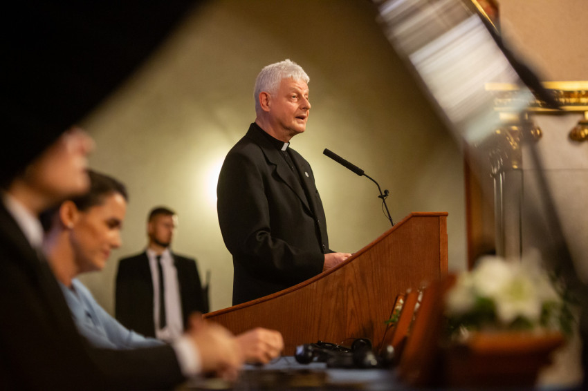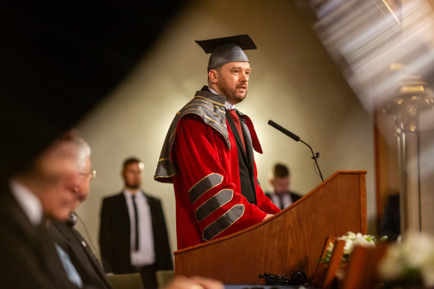 Kovács Bálint beszédében kifejezte, alázattal fogadja a megtiszteltetést, amit ráadásul államelnökök előtt vehet át. Köszönetét fejezte ki a hallgatók ösztöndíjáért az üldözött keresztények megsegítéséért felelős államtitkárságnak és a Hungary Helps Programnak. Mint mondta, az örmények azon kevés ókori népek közé tartoznak, melyek mind a mai napig államot tudnak alkotni, mindig meg tudták védeni saját identitásukat, melyben a kereszténység szerepe elvitathatatlan. Ezért is nagy öröm, hogy katolikus egyetem adhat otthont az örmény tanulmányoknak. A tanszékvezető ismertette az örmény történelem jelentős eseményeit, melyben az optimizmus és a jövő felé haladás minden nehézség ellenére hangsúlyos volt.