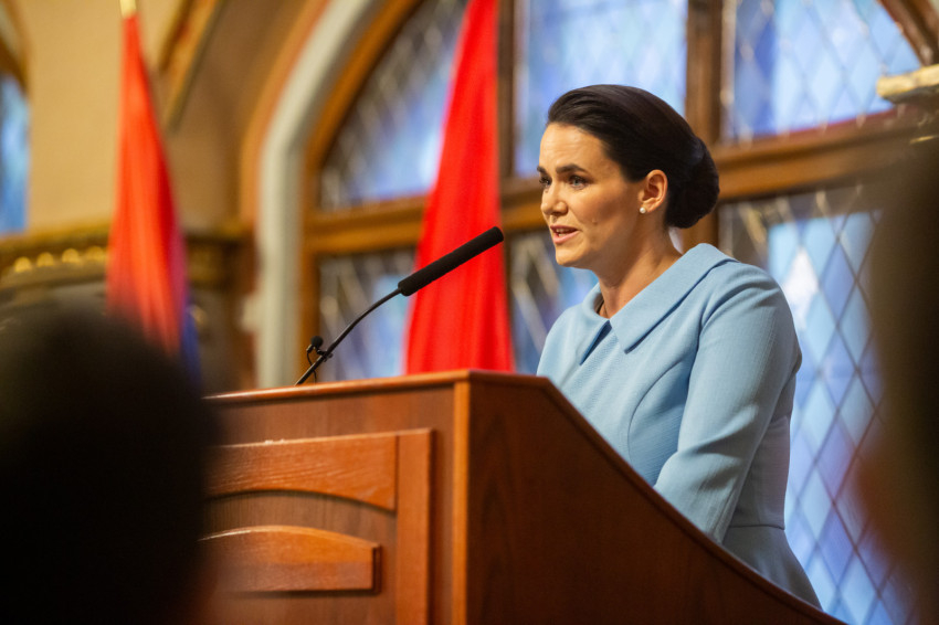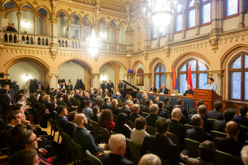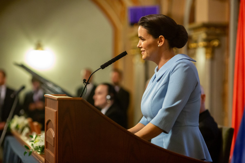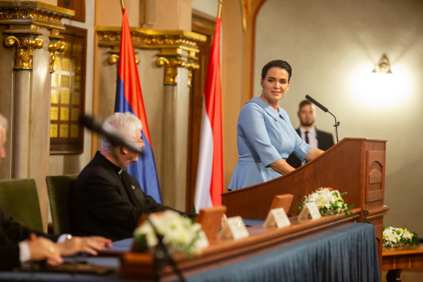 Novák Katalin ünnepi beszédében elmondta, Magyarország és Örményország a közelmúltban újraindította diplomáciai kapcsolatait. A két elnök berlini találkozója során megfogalmazódott, hogy mindkét országot a kereszténység alapján hozták létre, Magyarországot ezer éve, Örményországot 1700 éve, a két ország kapcsolata ma is erre az alapra épül. Nem véletlen, hogy a Pázmány Péter Katolikus Egyetemet látogatják meg közösen. Magyarok és örmények felelősséggel tartoznak egymás iránt, és közösen szeretnék kimondani az üzenetet a világ számára: a kereszténységnek van létjogosultsága, az értékekért ki kell állni, és küzdeni kell, nem a háború, hanem a béke az, ami a boldogulásunkhoz hozzá tud járulni, a megteremtése lemondással jár. Ezt az üzenetet szeretnék átadni a következő generációnak és azoknak is, akik Örményországból érkezve magyar állami ösztöndíjjal tanulhatnak itt, vagy akik Hegyi-Karabahból érkeztek ide.
