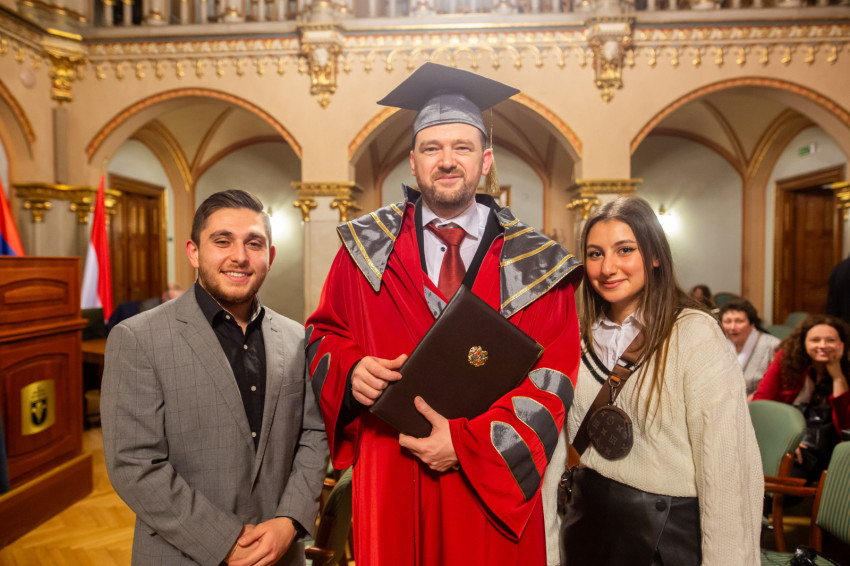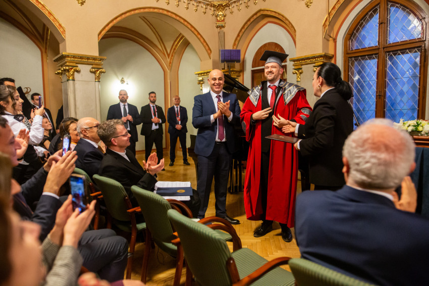 A továbbiakban az Örmény Állami Pedagógiai Egyetem Történelem- és Társadalomtudományi Karának dékánja, Edgar Hovhanniszjan méltatta Kovács Bálintot, aki 2002-ben fordult az örmény kultúra tanulmányozása felé, 2010-ben PhD-fokozatot szerzett történelemtudományból. 2008-tól a Közép-Európa Intézet tudományos munkatársaként tudományos könyvsorozatot indított az örményekről. A dékán kiemelte, 2016-ban akkor alapították a PPKE-n az Armenológiai Tanszéket, amikor a két ország között még nem voltak diplomáciai kapcsolatok. Kovács Bálint angol nyelvű képzést hozott létre, amelyre a Hungary Helps Programon keresztül Örményországból és a diaszpórából is érkeztek hallgatók. A tanszékvezető hét konferenciát és három nemzetközi kiállítást szervezett a témában, fontos szerepet vállal az örmény kultúra terjesztésében. „Kovács Bálint szíve az örményekért dobog, mi pedig téged nagyon szeretünk, ezért díszdoktori címet adományozunk” – zárta méltatását baráti szavakkal az egyetem dékánja.