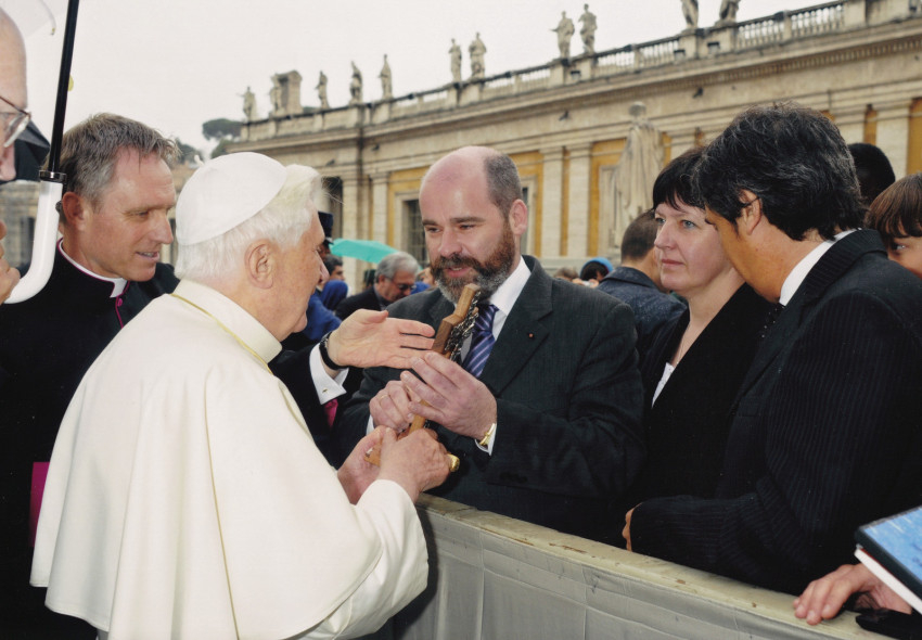 Ozsvári Csaba 2009 áprilisában egy schönstatti egységkeresztet ajándékoz XVI. Benedek pápának